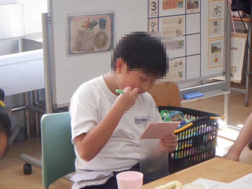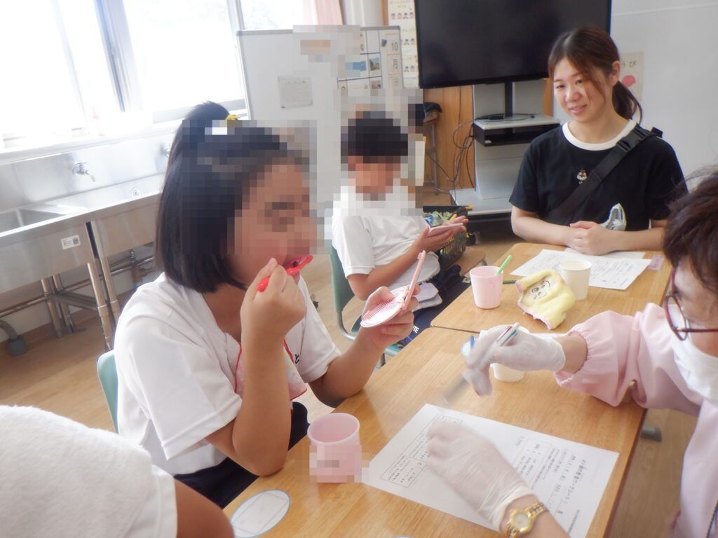 歯の染め出しをした後は、みんな鏡をよく見ながら歯が白くなるまで歯みがきをすることができました。