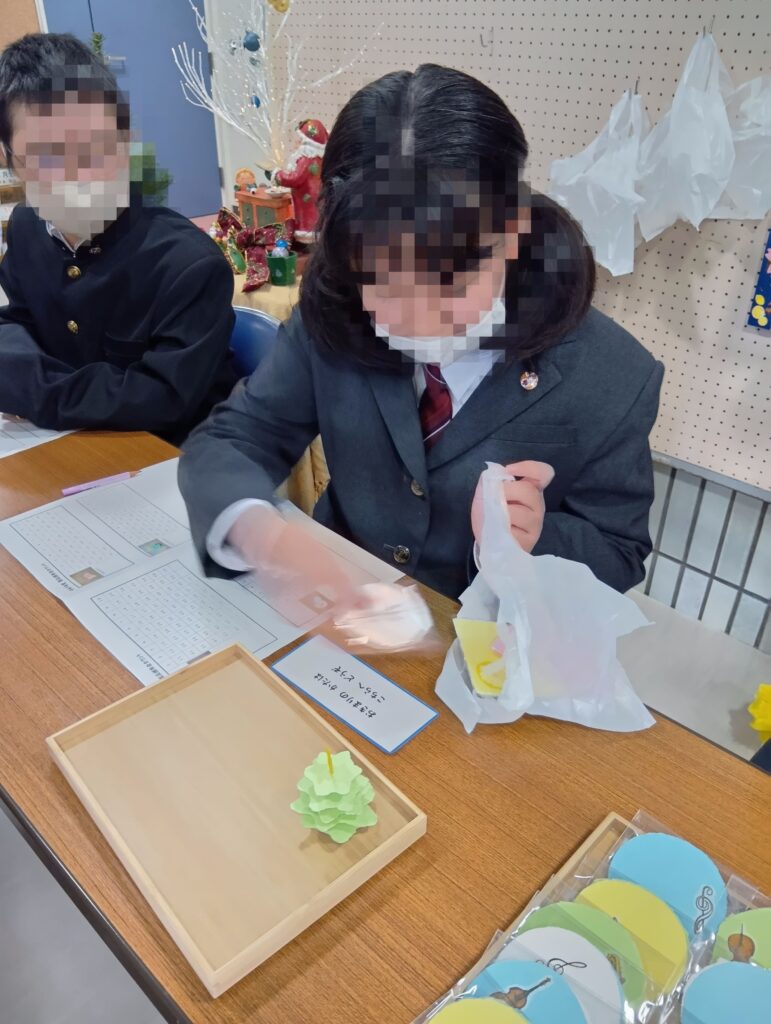 紙すき班はすいた紙で作ったクリスマス飾りやコースター、ハガキなどをお客様に選んでいただき、袋詰めしてお渡ししました。たくさんのお客様に来ていただき、また「すごいね!」「ありがとう!」と声をかけていただきました。