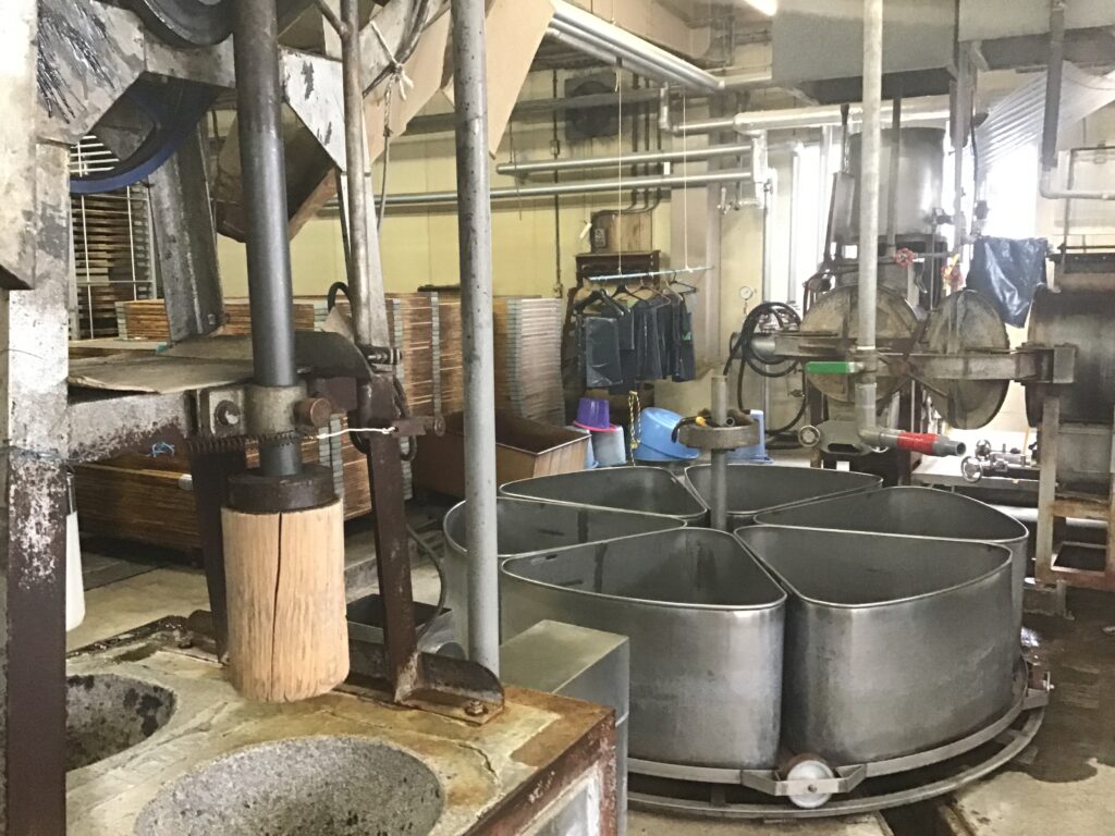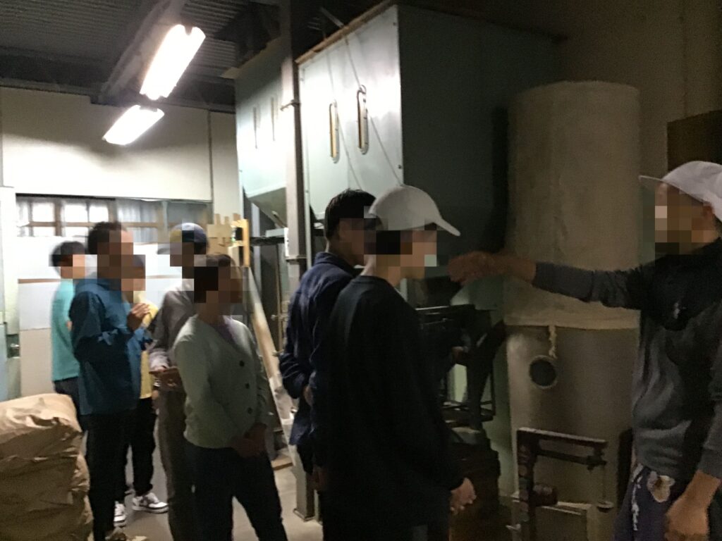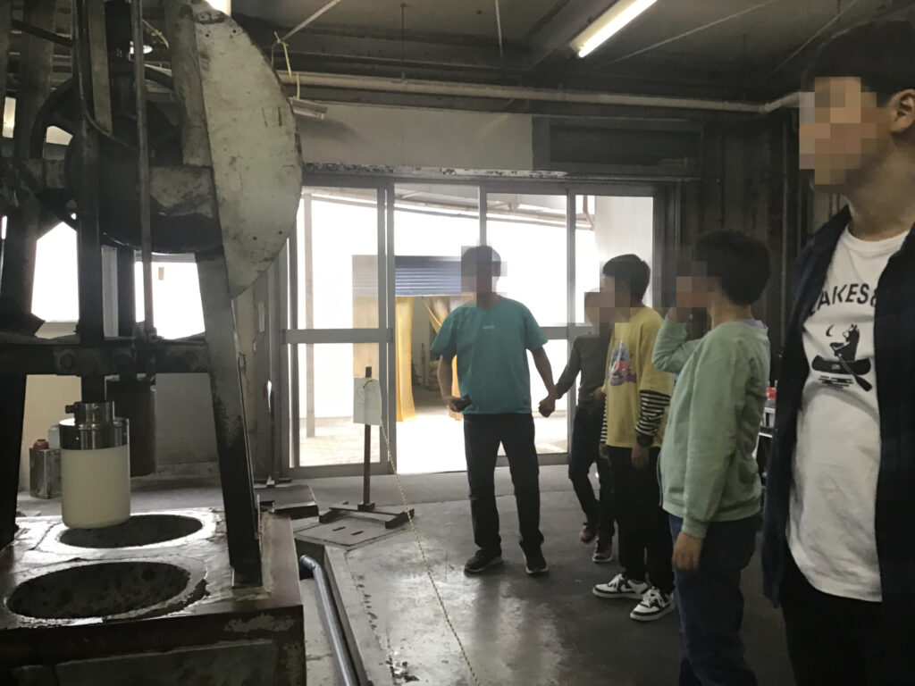 うるち米をつく機械に圧倒されながら見学。