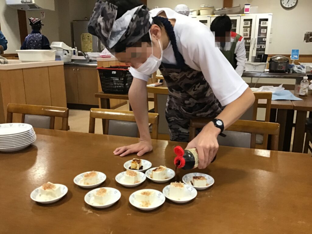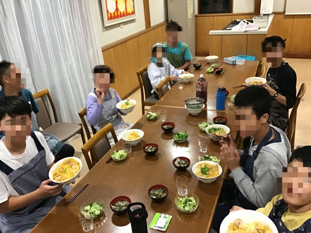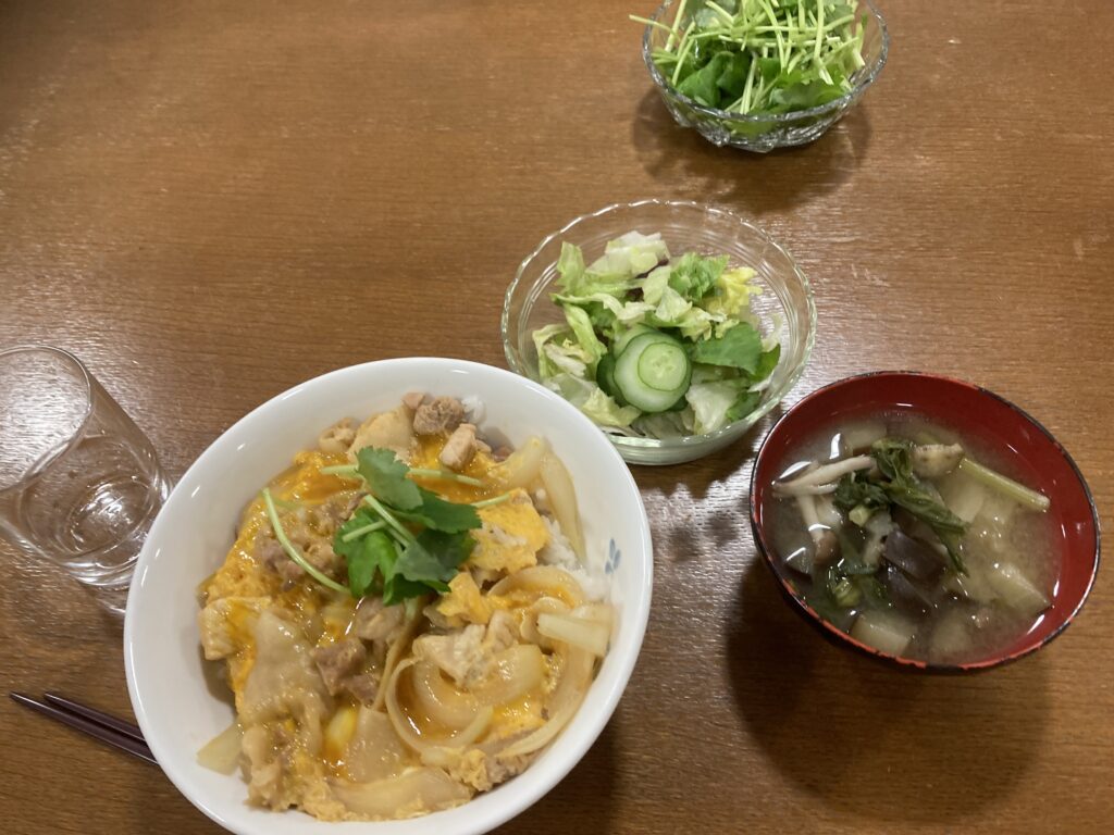 メインは親子丼、サラダ、味噌汁。バランスの良い食事ですね!買い物も自分たちで行きました。役割分担をしつつ、自分の丼は自分で作ります。