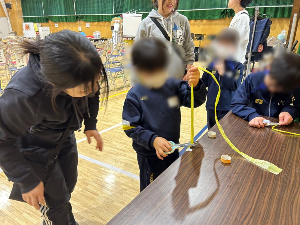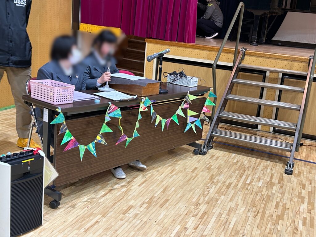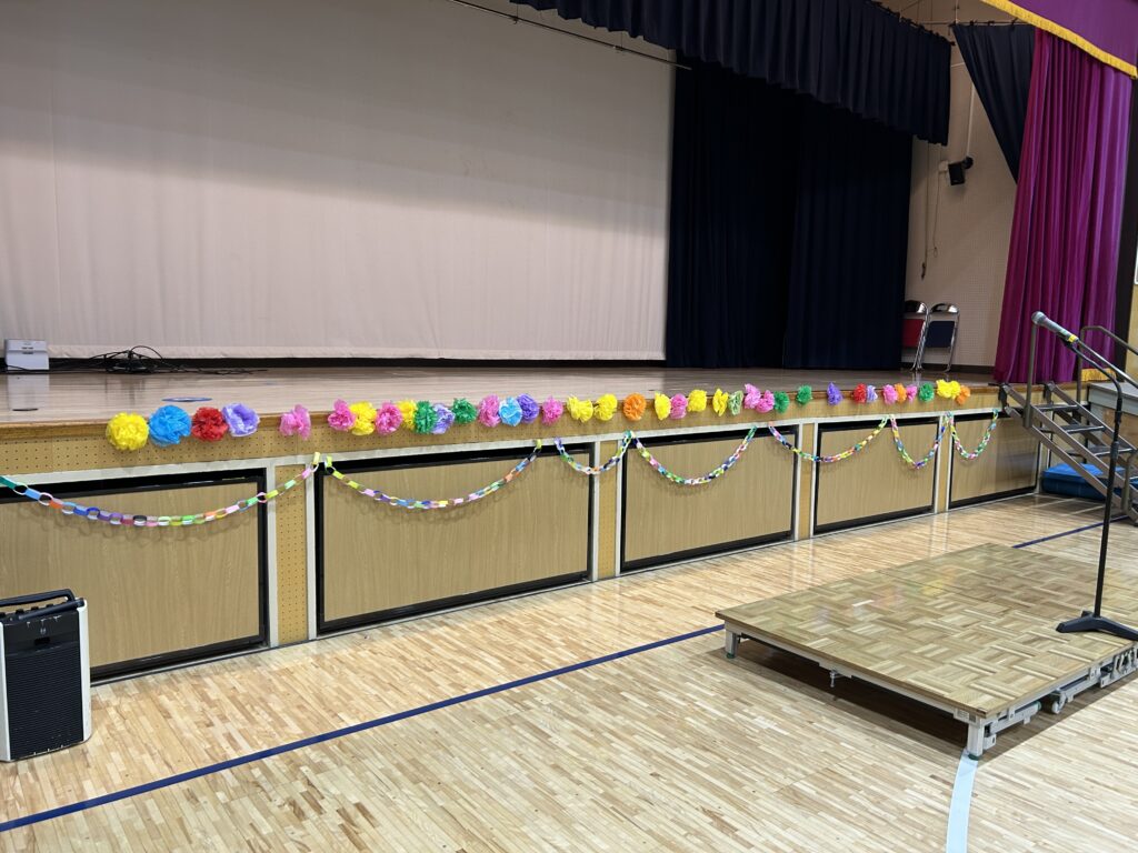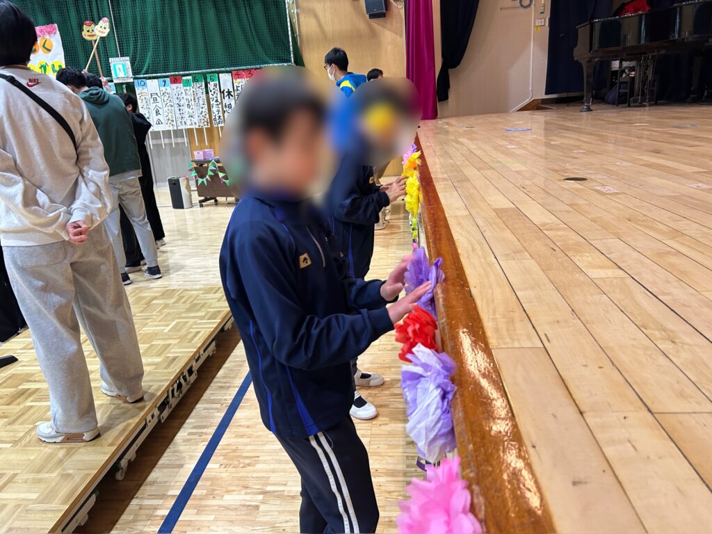 1組さんは放送席と受付の飾りつけ、2組さんと3組さんはステージの飾りつけをしました。