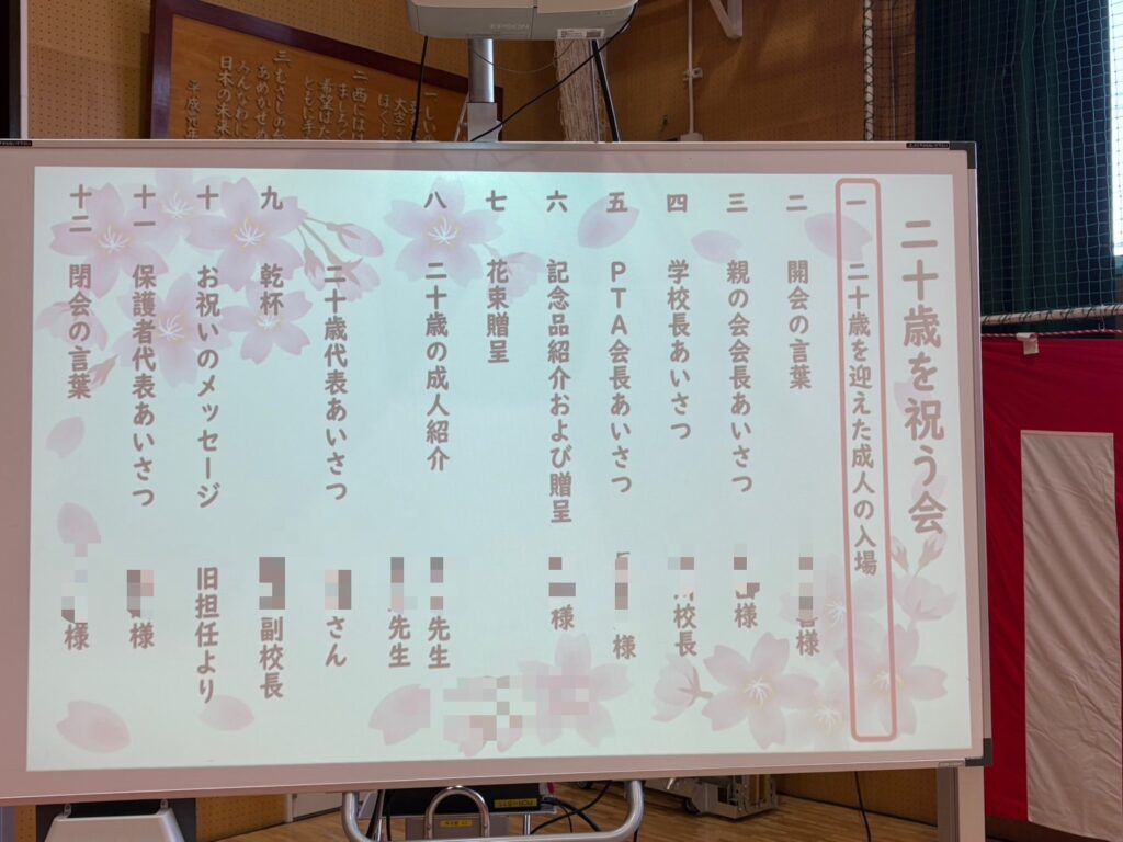 各自治体でも二十歳を祝う会は開催されておりますが、本校でも思い出の詰まった学校に学年を超えて集まり、皆で昔を懐かしみながら晴れの日をお祝いする「二十歳を祝う会」が毎年行われています。