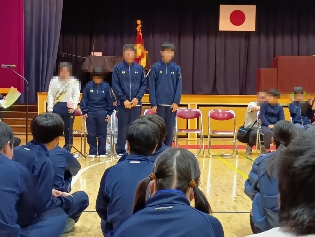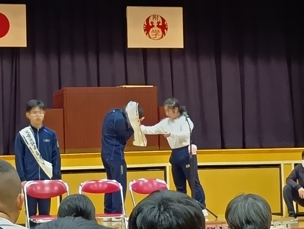 2月16日(月)、今年度最後の全校朝会が行われました。卒業生紹介と生徒会の引継ぎ式がありました。