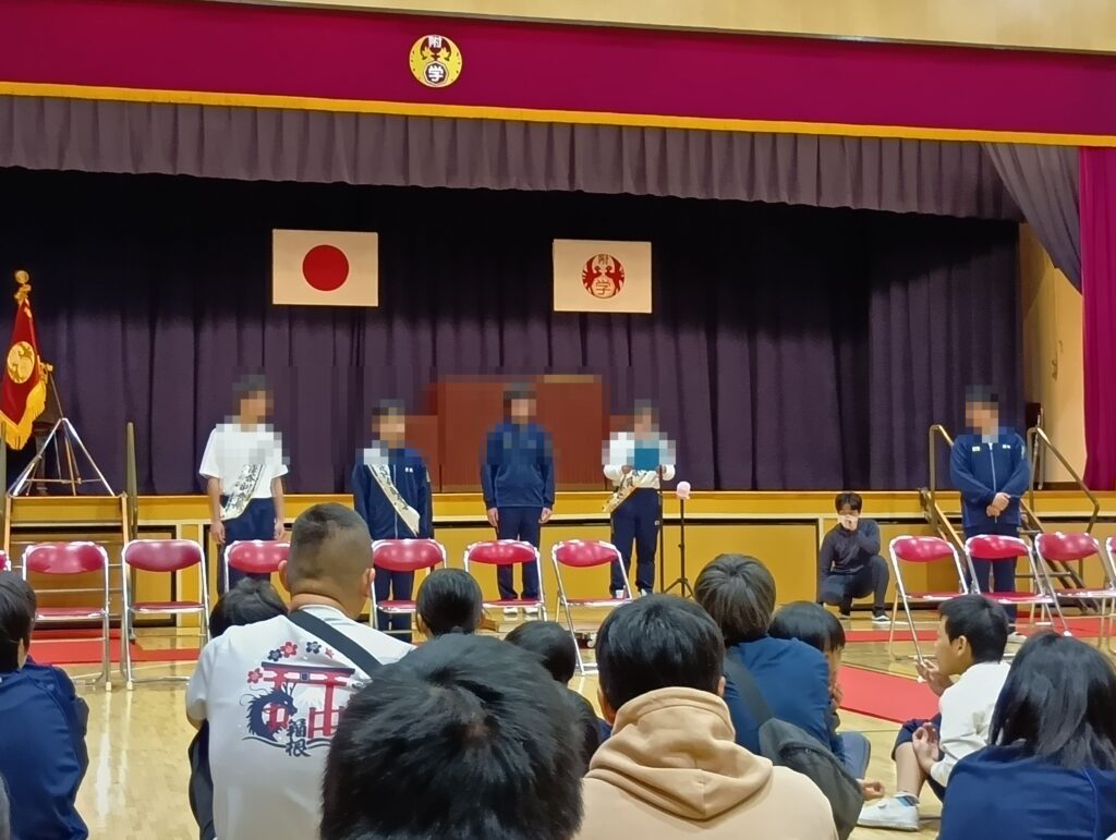 生徒会の引継ぎ式では、旧生徒会長からの「楽しい学校を作ってください。」の言葉を受けて、新生徒会長は「楽しく過ごせる学校を目指し、皆さん、協力しましょう。」と力強い発表がありました。