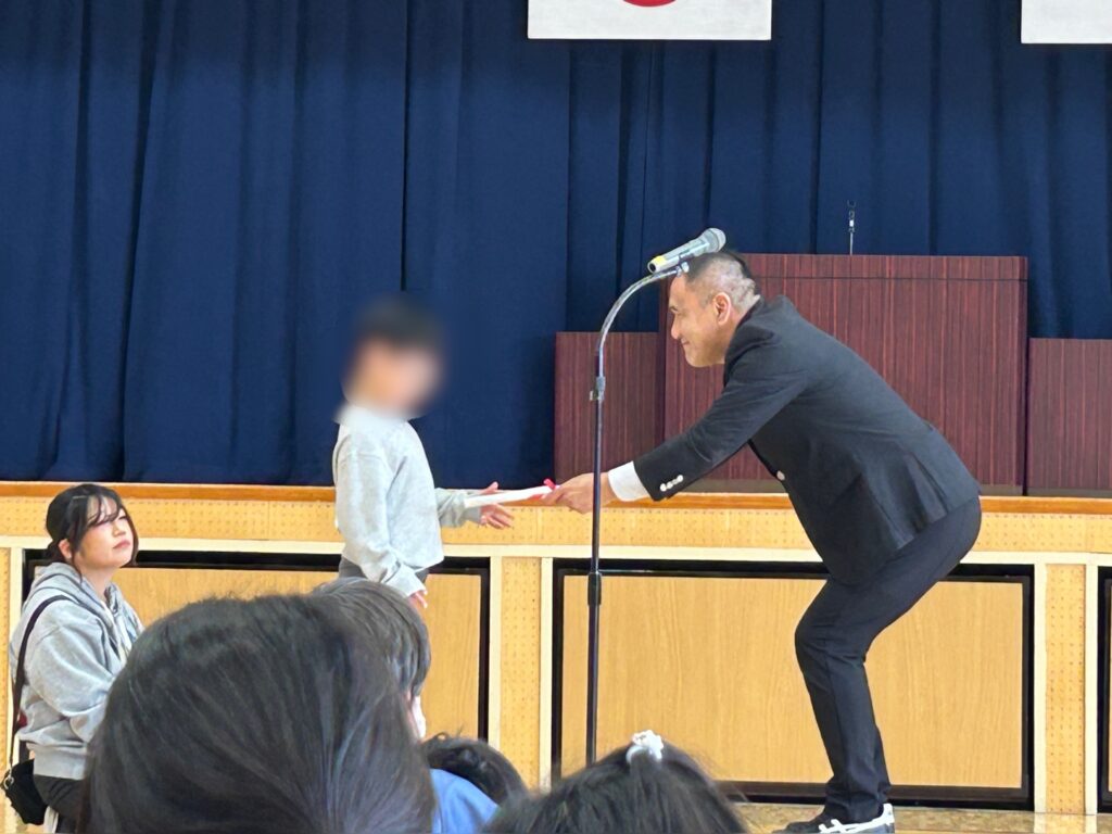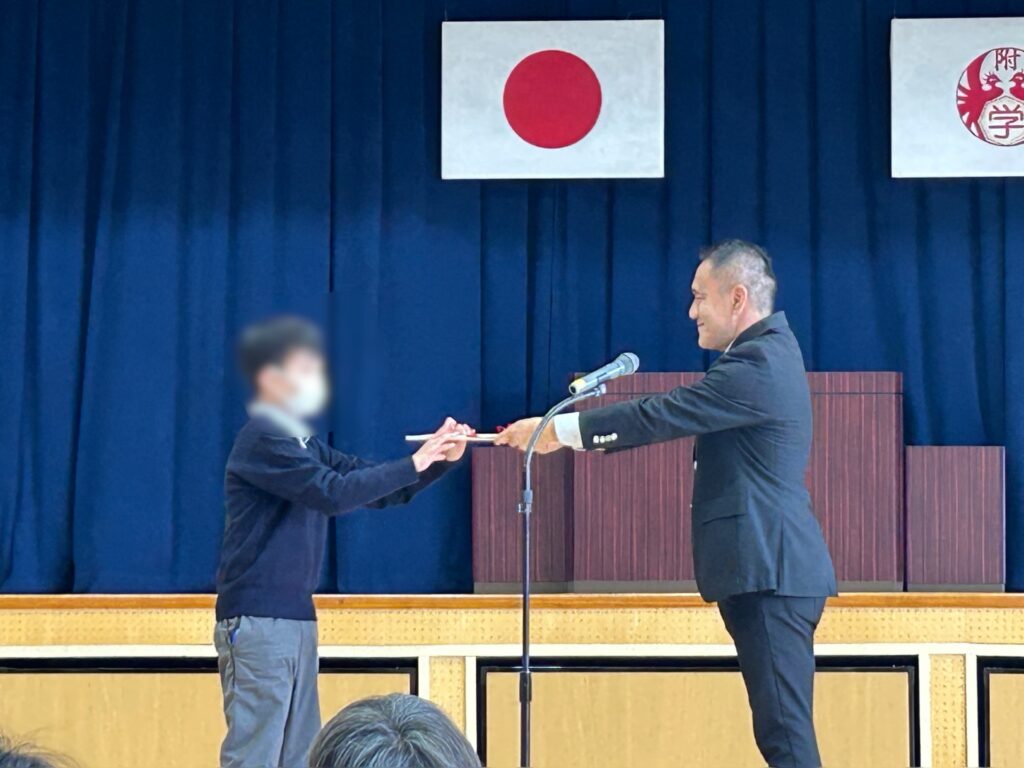 1時間目は全校での修了式で、各クラスの代表が校長先生から修了証を受け取りました。