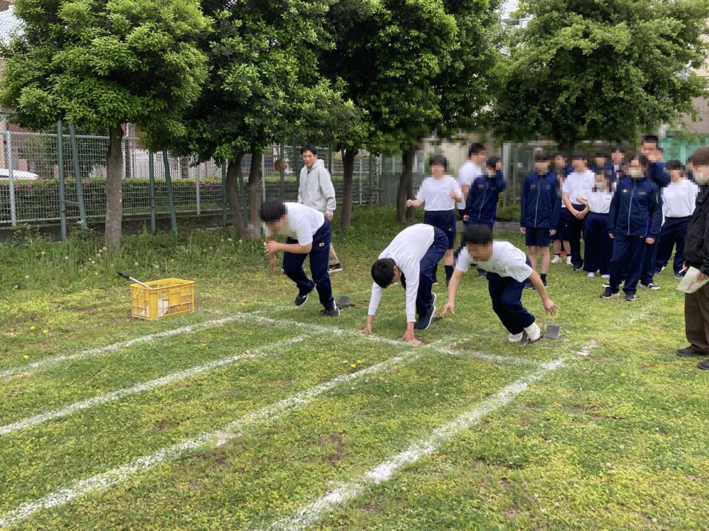 徒競走はスターティングブロックを使った構え方を練習してから走りました。
