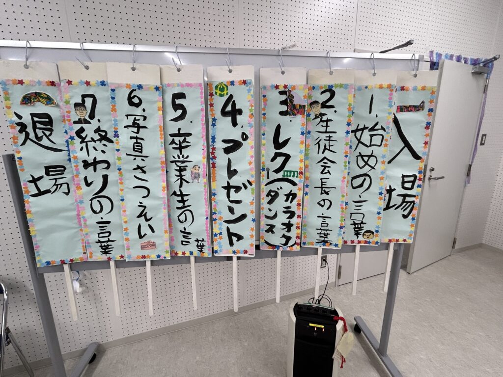 3年生を送る会が行われました。1、2年生は、招待状作りやプレゼント作り、会場装飾などの準備を進め、この日を迎えました。これまでの感謝の気持ちを込めて、一緒に歌を歌ったり、ダンスをしたりして、大いに盛り上がりました。3年生の先輩方、今までありがとうございました。